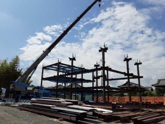 大きなクレーンで鉄骨をどんどん運び、とび職人さんが仮止めを施していきます。 あんなに高い所をスルスルと移動していく、バランスがとてもすごいです !! 2日目仮止めし …